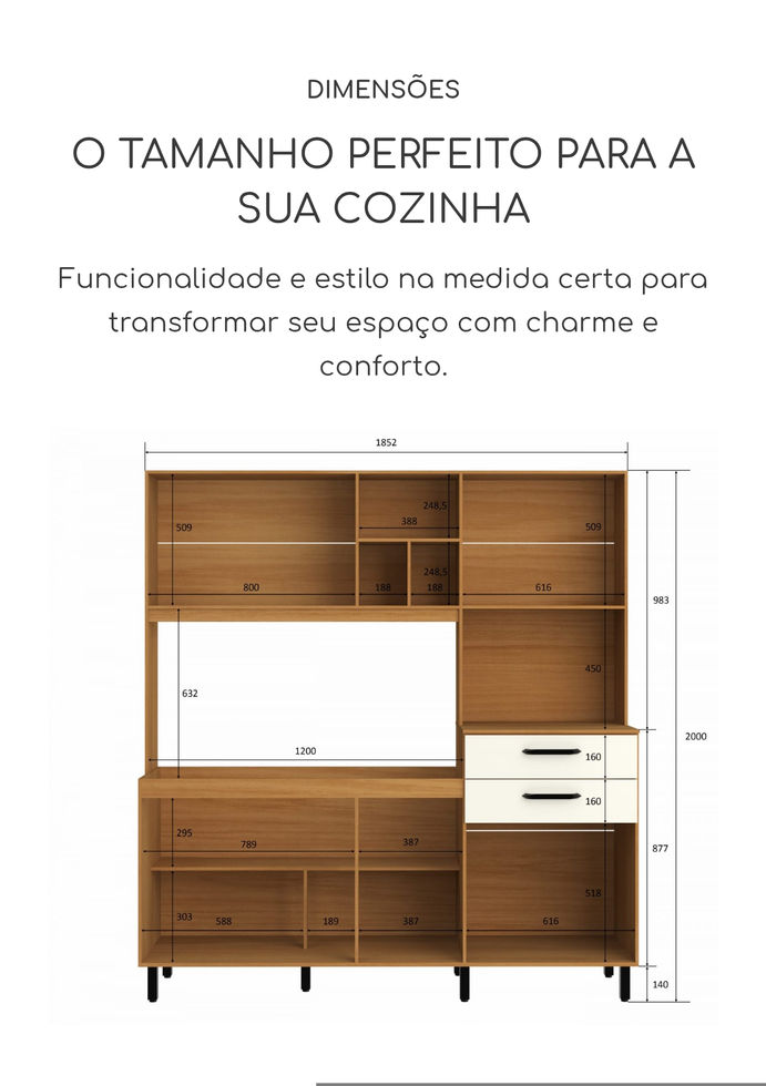Organização e funcionalidade em um só lugar: espaço para micro-ondas e nichos externos práticos e acessíveis.
